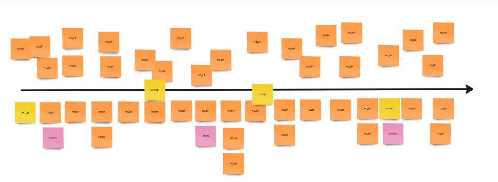 Тепер спускаємо часову лінію та мапимо під нею приблизно першу, останню та середню події (далі їх реальний порядок скоріше за все зміниться). Розбиваємося на 2 команди (намагайтесь врівноважити їх по спеціалізаціям) та рушаймо в окремі кімнати (Zoom/MS Teams rooms). Задача першої команди – вибудувати послідовність подій від першої до середньої, задача другої – від середньої до останньої події.