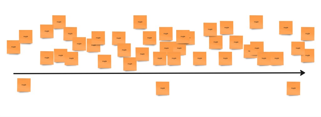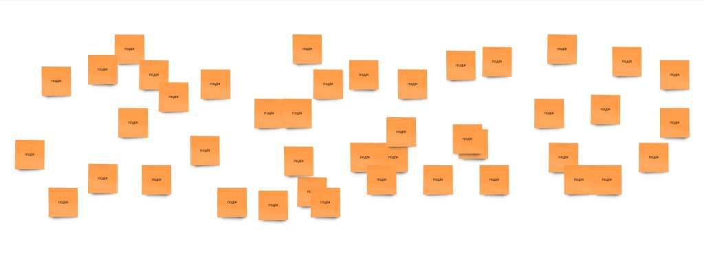 Всі генерують-пишуть події на стікерах. Один стікер – одна подія. Краще писати в incognito mode (miro), щоб домогтись більшої варіативності від учасників. Пишемо все, що приходить в голову, не переймаючись, що в голову лізе якась фігня з кінця системи або тільки події з початку флова. Якщо намагатись записувати події одразу в хронологічному порядку, то ви надовго застрягнете і будете постійно переставляти їх місцями. До 5-7 хвилин.