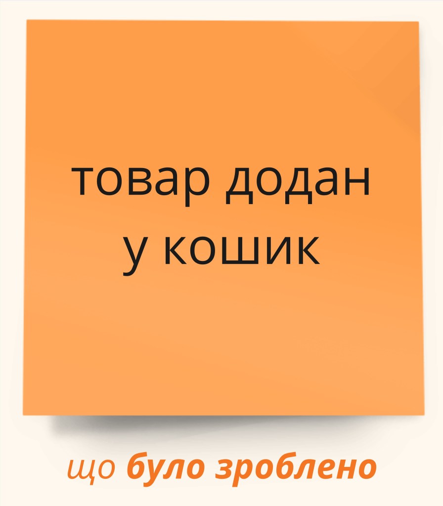 Подія – факт, завершена дія в минулому часі, дає розуміння що було зроблено, що сталося в системі, має технічний та бізнесовий сенс (file attached, call received, money withdrawn, послугу підключено, рахунок поповнено). Помаранчевий стікер.