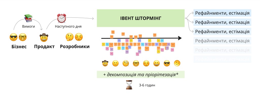Наполегливо рекомендую після Івент Штормінга (після перерви або на наступний день) провести тим самим складом воркшоп по декомпозуванню фічі на інкрементальні частини та погодити етапи розробки.
