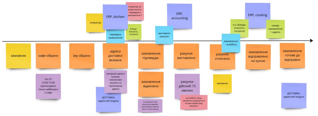 Не намагайтесь будувати щось по типу BPMN чи UML, це зайве і сильно гальмуватиме вас. Також не намагайтесь оперувати категоріями інтерфейсів, кнопок, інпутів, на цьому етапі це звузить розуміння цінності. Але якщо не зможете уникнути дизайну інтерфесів, то введіть окреми стікер (білий?), що буде відповідальним за UI-нотатки. Намагайтесь використовувати меньше стрілочок між стікерами, а якщо в стрілочках вже складно розібратись, значить щось не так з логікою всієї послідовності, інкаше вам би не хотілося все стрілочками зʼєднувати.