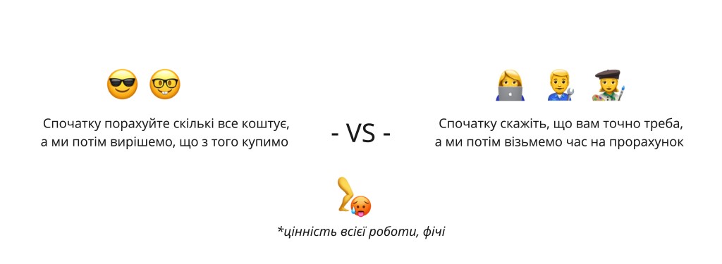 Вся пріоритезація має базуватися лише на користі для кінцевого споживача, тобто для бізнеса, а не на людино-годино-папугах. Сам процес оцінки задачі – ледь не половина роботи з розробки, бо треба зануритись, спроектувати дизайн та архітектуру, витратити відчутний проміжок часу ат сил. Але яка різниця, скільки коштує саме оця частина функціональності, якщо вона дрібʼязкова для споживача (для бізнеса) порівняно з іншими? Чи дійсно бізнес готовий оплачувати оцінку задачі, яка наврядчи буде реалізована?